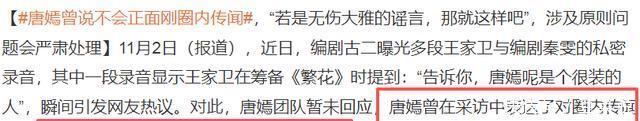而网友们也一直期待被王家卫嘲讽”装“的唐嫣回应。但是几天过去了,唐嫣和工作室都十分冷静,并未有任何回应。而有网友扒出唐嫣曾在采访中表达过自己对于一些争议的看法。称只要不涉及原则性问题,对于网上的争议,是不会回应的。